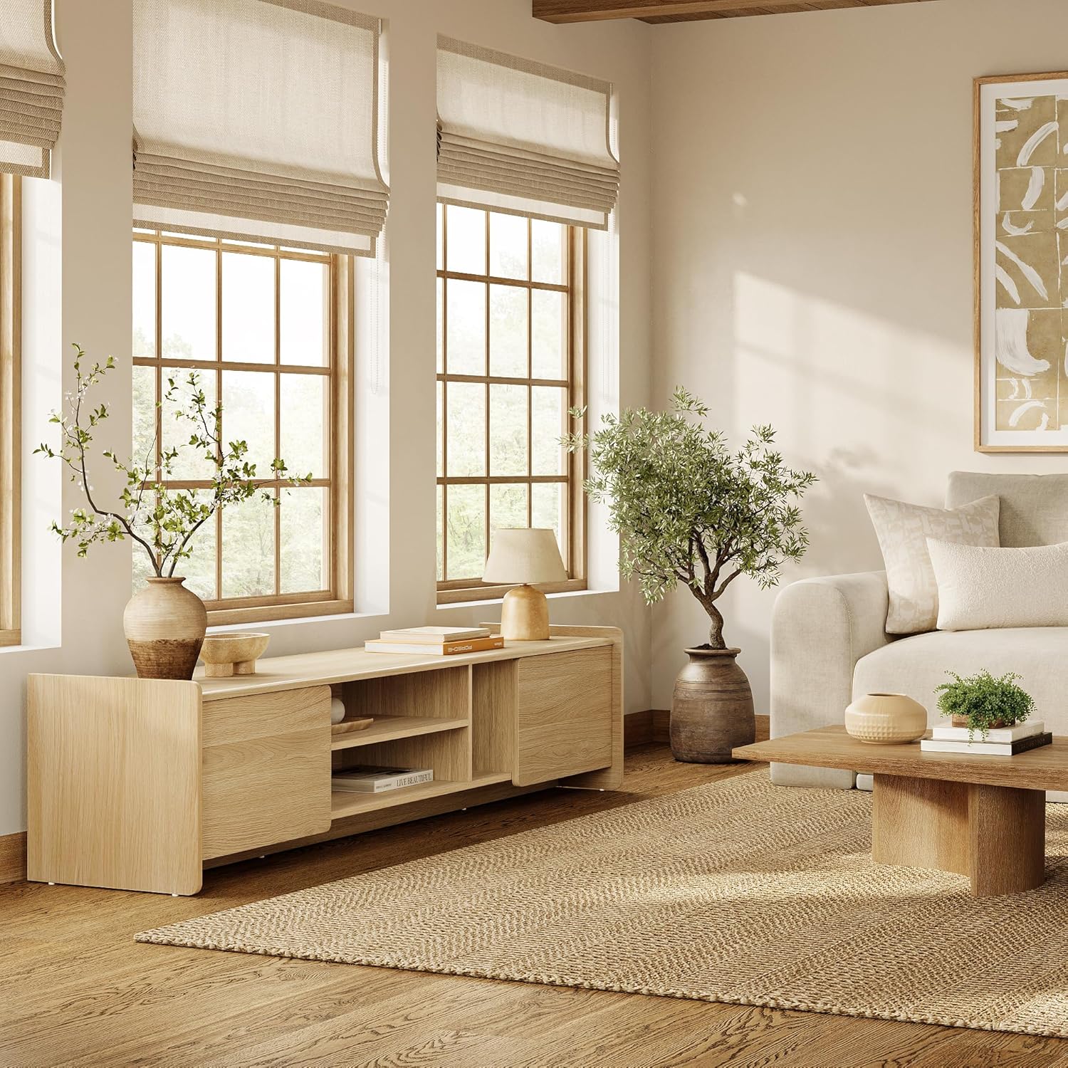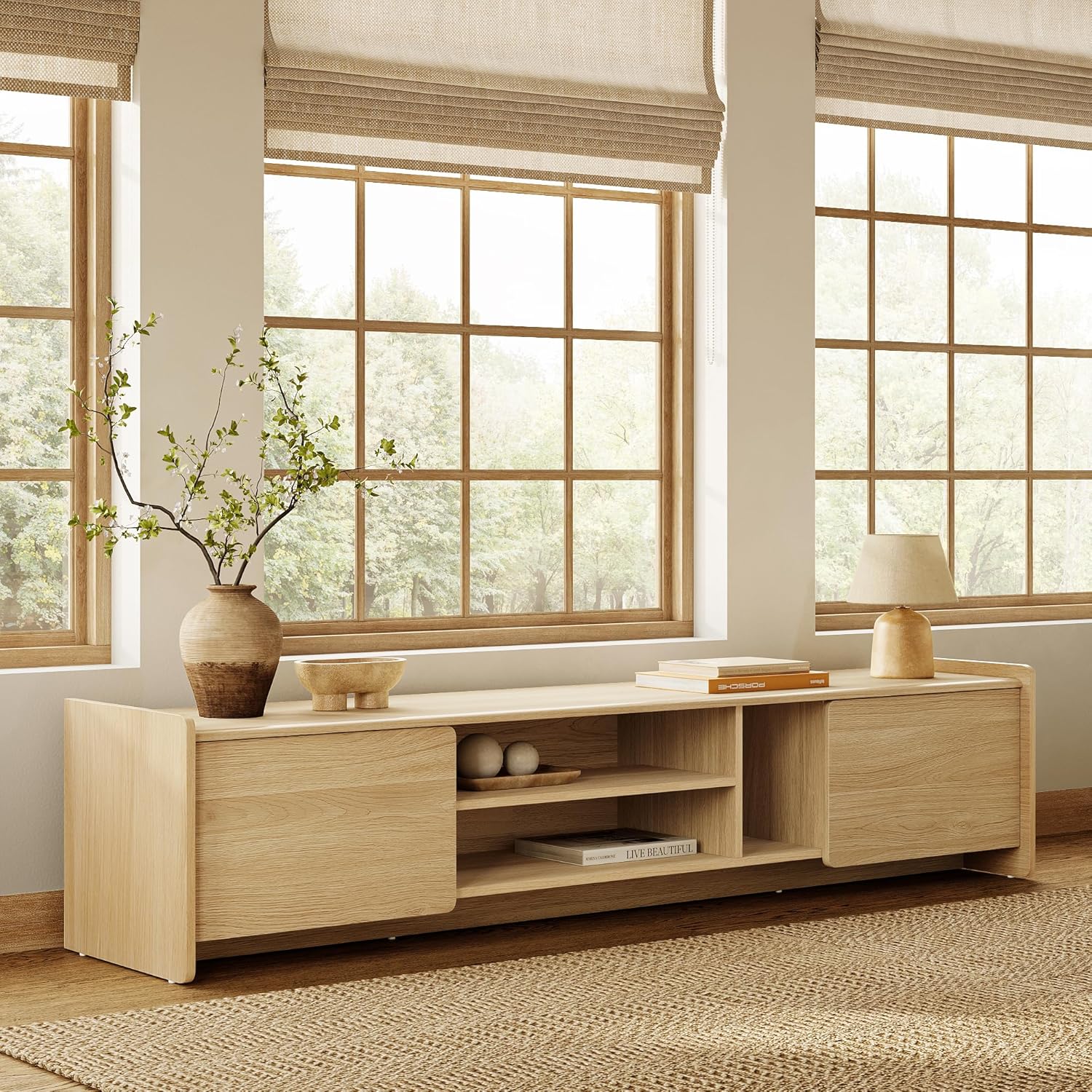 This 70-inch Modern TV Console Cabinet adds a touch of tranquility to the living room. The raised tray-edge on both sides helps keep cups, remotes, and decor from falling off, while the two swing doors protect items from dust. Center open shelving organizes books, game systems, and media players, and a rear cable grommet keeps wires tidy. Sized for larger screens, it works beautifully as a TV stand, a sleek console table, or the focal point of your entertainment center. With its clean profile and Japandi warmth, this is a truly modern TV console that doubles as a stylish display cabinet. Easy assembly with labeled parts.