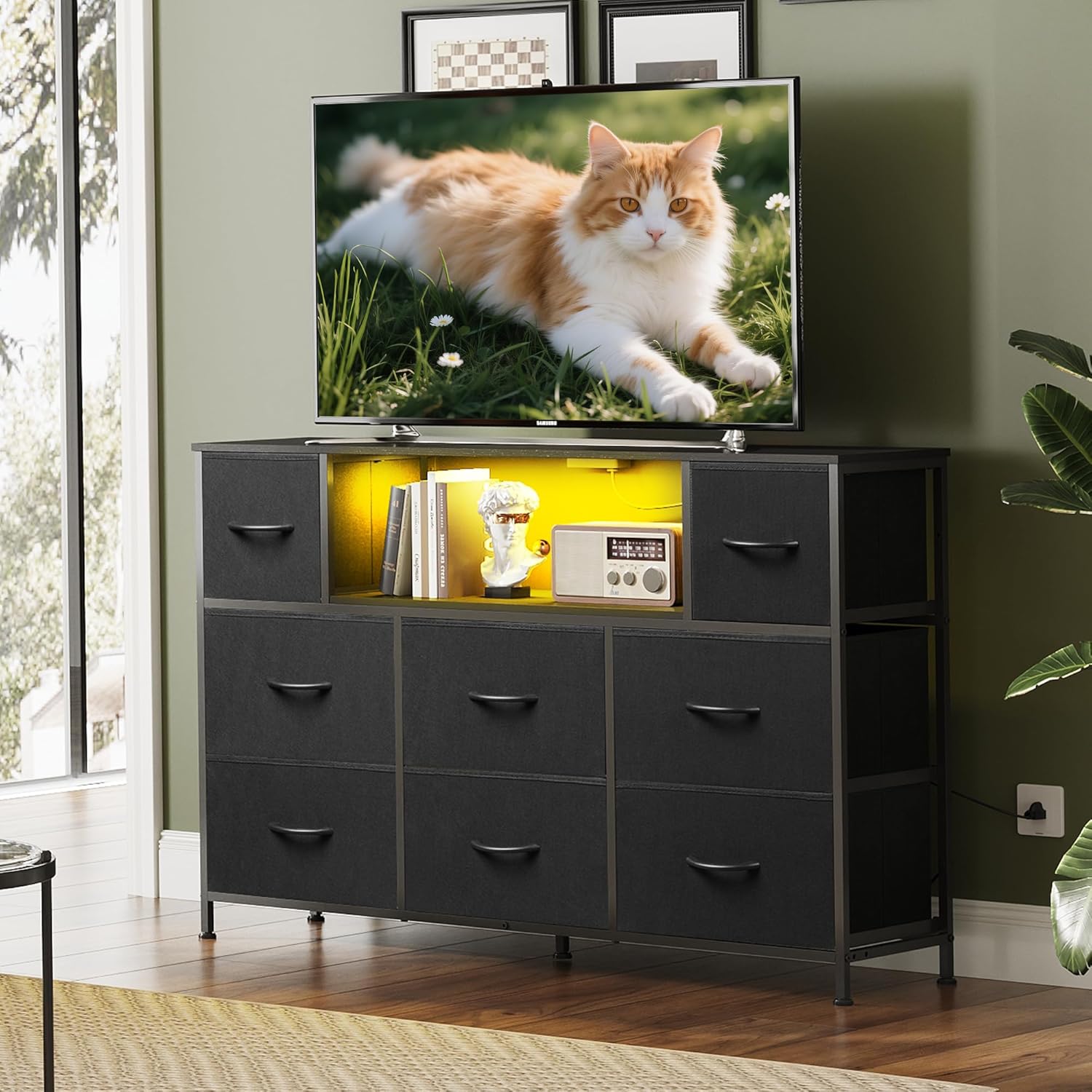 WLIVE Black TV Stand for 45, 50, 55 inch TV, Entertainment Center with LED Lights & Charging Station, TV Media Console Table with 8 Fabric Drawers and Open Shelves for Living Room, Hallway, Wood Top